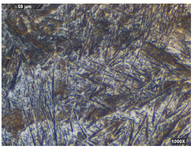 El estudio microestructural se realizó en la sección transversal o perpendicular a la dirección de deposición de las capas obtenidas del proceso de fabricación. Las muestras se observaron en un microscopio óptico Leica modelo DMI 5000M equipado con una cámara digital. Se aprecia que la microestructura se encuentra dispuesta por capas, y que el espesor promedio de cada capa es de 30 μm. A elevados aumentos (véase la figura 1), se distingue la fase acicular α, martensita de titanio, en una matriz de fase β, lo que indica que la aleación Ti-6Al-4V es una aleación de titanio bifásica α y β.