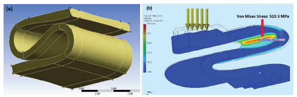 El inicio del desarrollo del implante se realizó a partir de la patente nacional C.I.P. 8A61F 2/44, tal como se muestra en la figura 2(a), en la que solo se define la forma geométrica, pero no la geometría exacta ni el proceso de manufactura. Era necesario establecer la geometría y el proceso de manufactura adecuado para que el dispositivo patentado alcance las características funcionales que estos requieren en su uso fisiológico; es decir, no se ha validado funcionalmente un producto final que garantice los parámetros adecuados de ángulos de flexión axial, flexión lateral, desplazamiento axial y resistencia a la fatiga en el uso fisiológico del implante desarrollado. Por tanto, se realizaron simulaciones computacionales usando el método de elementos finitos, en el cual, en cada una de las simulaciones, se fue variando los diferentes parámetros geométricos con el propósito de obtener como resultado una forma geométrica, de espesores y radios de curvatura que brinde la mejor combinación entre resistencia y flexibilidad requerida para el servicio de un implante discal cervical. En la presente investigación se define el prototipo de implante en forma de "S" que tiene dos zonas de curvatura aguda orientadas en sentido opuesto, esto es, la primera curvatura está orientada hacia la derecha y la segunda curvatura hacia la izquierda.El prototipo del implante cervical debe reproducir, lo más cercano posible, los rangos de movimiento naturales para cada desplazamiento entre los diferentes pares de vertebras de la columna. En Panjabi [13] y Shabnam [14] se encuentra información relevante sobre la rigidez de los discos cervicales de cada desplazamiento, así como los datos de propiedades mecánicas utilizadas como datos de entrada para la simulación del diseño del prototipo. Los resultados numéricos de la simulación realizada (tal como lo muestra la figura 2b) permitieron definir la geometría a partir del cual se fabricaron, mediante SLM, los primeros prototipos.