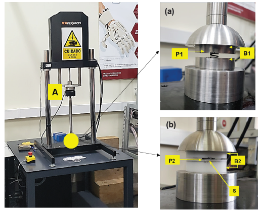 Flexión-compresión. Configuración (como se observa en la figura 3a) utilizando un soporte de acero.- Ensayo de fatiga. Configuración (como se observa en la figura 3b) utilizando un soporte de polietileno.