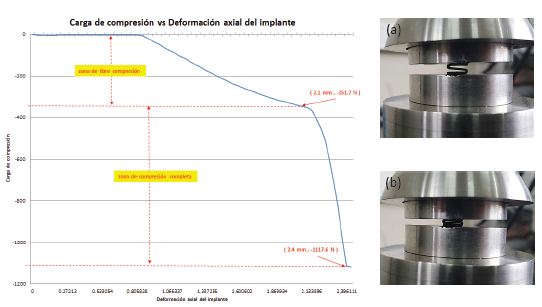 Los resultados del ensayo permitieron encontrar la máxima carga de compresión que el implante puede soportar antes de que se deforme a un nivel tal que pierda la funcionalidad de los labios de la forma de "S". Se respetó el mismo procedimiento para los prototipos 2 y 3 de esta investigación.