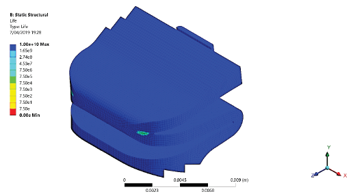 La simulación por elementos finitos del prototipo del implante cervical permitió identificar la zona de máximos esfuerzos mecánicos a las que estará sometido el componente, tal como lo muestra la figura 5. Además, se pronosticó un escenario superior de cinco millones de ciclos fatiga del prototipo. Las pruebas realizadas en laboratorio demuestran una clara diferencia en la resistencia a la fatiga del componente simulado y ensayado. Ahora bien, los resultados de la simulación por elementos finitos tienen como punto de partida la conceptualización de un modelo con propiedades mecánicas isotrópicas y sin imperfecciones físicas ni metalúrgicas. En este sentido, es importante recalcar que el método de fabricación que se utilizó para los prototipos del implante cervical es un método innovador flexible a cualquier geometría del componente a fabricar; sin embargo, es altamente proclive a la generación de imperfecciones físicas tales como porosidades o cavidades que afectan significativamente las propiedades mecánicas del prototipo [4], en especial a la fatiga.
