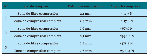 Los ensayos permitieron encontrar las zonas de libre compresión y la zona de compresión completa del componente (véase la figura 4). Los resultados de los ensayos se presentan en la tabla 4.