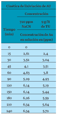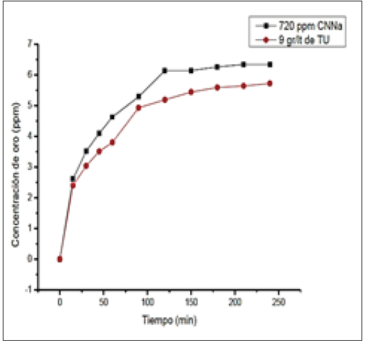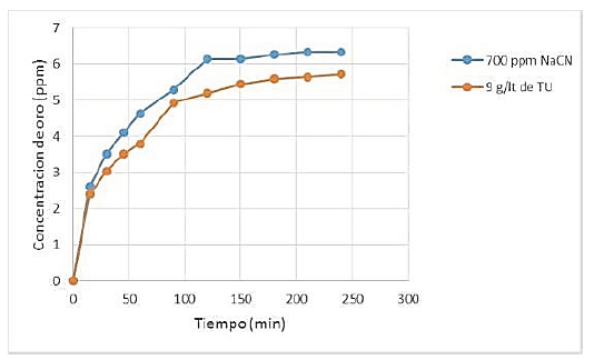 Los resultados obtenidos demuestran que tiourea como agente lixiviante del concentrado de Au presenta menor porcentaje de recuperación de este metal al proporcionado por cianuro. Esta diferencia alcanza un valor de 0,62 g de Au/L a los 240 min de agitación. Esto, en términos de recuperación de oro, representa un 34,13 % con cianuro y un 32,39 % con tiourea. Por tanto, la mejor extracción de oro se obtiene en la lixiviación con cianuro (1,74 % mayor que TU) durante el proceso de lixiviación de concentrados de oro por flotación.