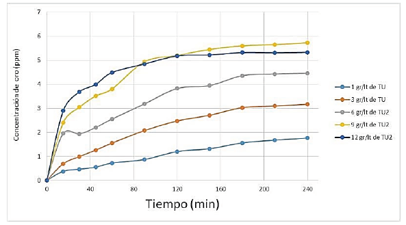 Las curvas de los resultados obtenidos durante el proceso de lixiviación con tiourea se muestran en la figura 1, en la cual se puede observar que, al aumentar la concentración de tiourea de 1 a 12 g/L, incrementa también la concentración de oro. La concentración de tiourea de 9 g/L fue la que tuvo la mayor recuperación de Au.