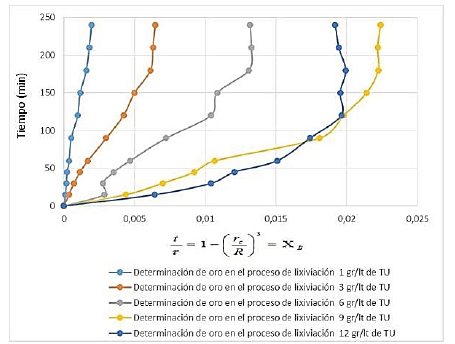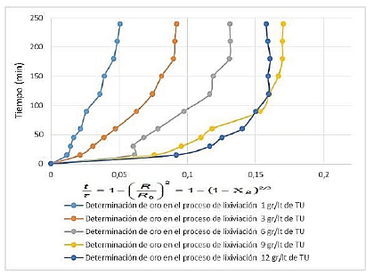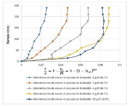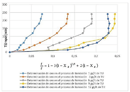 De acuerdo con la figura 5, este proceso de lixiviación del mineral aurífero con TU, con una concentración de 9 g/L, lo controla un modelo de difusión externa. Este modelo cinético de lixiviación también ha sido reportado por [13], quienes realizaron un estudio cinético de lixiviación de oro con un nuevo agente orgánico denominado "3YL", el cual presenta características más favorables comparadas con la cianuración, ya que son menos tóxicas y presentan mayor velocidad de lixiviación. Es decir, se produciría una difusión del ion auroso a través de la capa de azufre que se forma sobre la partícula del mineral.