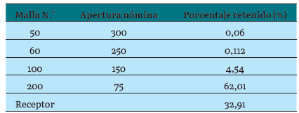 Los resultados del análisis de granulometría muestran que los porcentajes de retención de mineral (tabla 1) son más bajos para las mallas n.° 50, 60 y 100, a diferencia de la n° 200 que tiene una retención de 62,01 % [10].