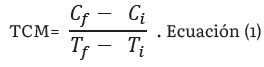 Donde Cf y Ci corresponde al crecimiento final y crecimiento inicial a las 96 y 24 horas, respectivamente, expresados en cm. Tf y Ti es el tiempo final y tiempo inicial de las mediciones, representados en días, respectivamente.