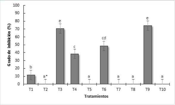 Respecto al grado de inhibición (GI) se ratificó la tendencia observada en las dos variables anteriores (CMR y TCM), siendo Trichoderma sp. (T9) y Aspergillus niger (T3) las cepas que ejercieron mejor capacidad antagónica al registrar una inhibición en el crecimiento de Phytophthora sp. del 74,36 y 70,52 %, respectivamente, comportándose estadísticamente iguales entre sí y diferente de los demás tratamientos (p<0,05) (figura 1).
