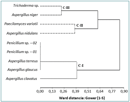 La prueba de la distancia de Gower y el método de agrupamiento jerárquico de Ward, aplicado a la interacción de las tres variables analizadas (CMR, TCM y GI), como medida del desempeño antagónico global, permitió la formación de tres conglomerados entre las nueve cepas evaluadas: C-I (Penicillium sp. - 01, Penicillium sp. - 02, Aspergillus glaucus, Aspergillus terreus y Aspergillus clauatus), C-II (Aspergillus nidulans y Paecilomyces variotii) y C-III (Trichoderma sp. y Aspergillus niger), con un coeficiente de correlación cofenética de 0,96 (figura 2). Esto indica la existencia de similitudes y diferencias entre algunos aislamientos por su capacidad controladora frente a Phytophthora sp.