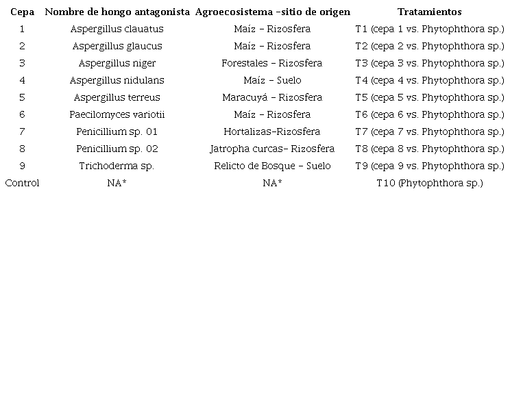 Se consideró cada una de las nueve cepas enfrentadas en pruebas de antagonismo in vitro contra Phytophthora sp., como un tratamiento. Asimismo, se estableció un tratamiento control, el cual consistió en la siembra de Phytophthora sp. en el medio de cultivo utilizado (PDA), sin ningún antagonista (tabla 1). La investigación se llevó cabo en condiciones controladas en el Laboratorio de Fitopatología de la Universidad del Magdalena (coordenadas 11°13'18"N y 74°11'10"O).