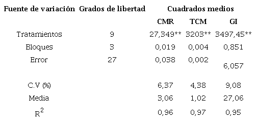 Los datos obtenidos en el experimento fueron sometidos a pruebas de normalidad, mediante las cuales se comprobó la distribución normal de los datos. Se realizaron análisis de varianza para las tres variables evaluadas y pruebas de comparación de medias mediante Tukey (p≤0,05) en los casos en los que hubo significancia estadística. En estos análisis se utilizó el software estadístico SAS versión 9.0.
