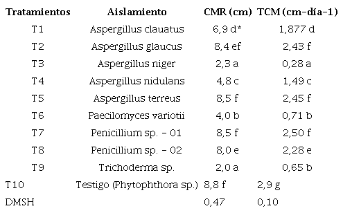 La prueba de comparaciones de medias según Tukey (tabla 3) mostró que los hongos correspondientes a los tratamientos T3 (Aspergillus niger) y T9 (Trichoderma sp) fueron los que más afectaron el CMR del patógeno Phytophthora sp., sin diferencias estadísticas entre sí (p≤0,05), restringiendo el crecimiento de Phytophthora sp. en un 70,5 y 74,3 %, respectivamente, respecto al tratamiento control (T10). Entre tanto, los hongos correspondientes al T2 (Aspergillus glaucus), T5 (Aspergillus terreus), T7 (Penicillium sp. -01) y T8 (Penicillium sp. -02) no afectaron el CMR del patógeno, permitiendo que este se desarrollara de manera similar a como lo hizo en el tratamiento control (tabla 3). A. niger (T3) fue el microorganismo que más afectó la TCM de Phytophthora sp, registrando un valor medio de 0,28 cmdía-1 y siendo estadísticamente superior a los demás (p≤0,05), mientras que las cepas Penicillium sp. - 01 (T7), Aspergillus glaucus (T2) y Aspergillus terreus (T5) mostraron una baja incidencia sobre la restricción de la TCM de Phytophthora sp. (tabla 3).