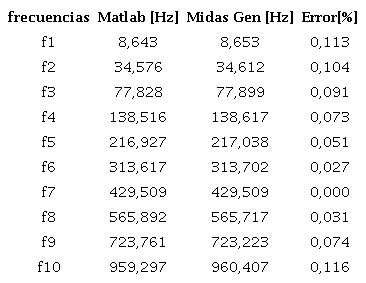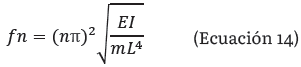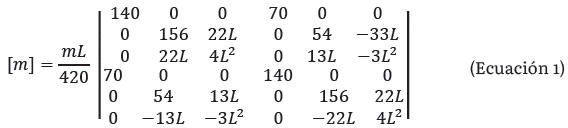 Las matrices calculadas de masa y de rigidez permitirán obtener las frecuencias naturales del elemento a partir de la siguiente fórmula: