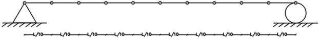 Al igual que en el modelo de la sección Resultados obtenidos para el análisis de vibración sin TMD, la viga se discretiza en 10 elementos, y se calculan las frecuencias de la viga incorporando el TMD, tanto en el código realizado en Matlab como en el modelo hecho en el software Midas Gen: