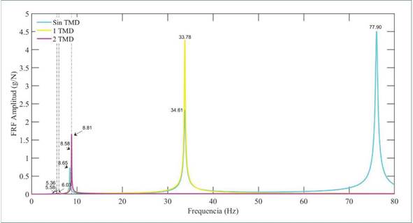 Se obtuvieron FRF para tres casos: resultados sin amortiguador, luego incorporando 1 y 2 TMD.
