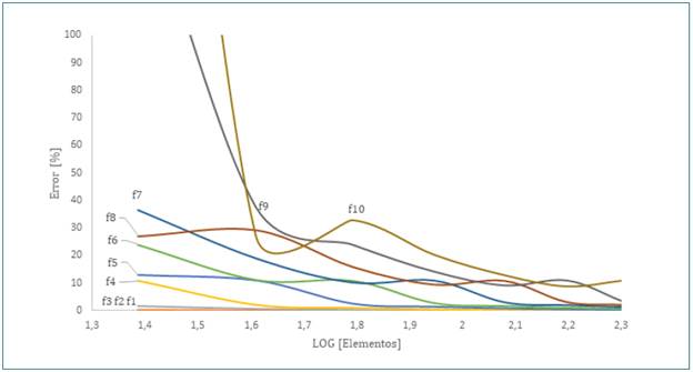 Para el análisis de la viga, usando el método de elementos finitos, se comprueba que al aplicar 10 elementos el error en los resultados se reduce si se comparan las frecuencias usando una menor cantidad de elementos, como se muestra en la gráfica 1. Del mismo modo, a medida que el número de frecuencias aumentan es necesario aplicar más nodos para que los resultados sean los más acertados posibles.