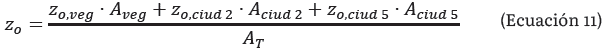Donde z0 veg corresponde al valor de longitud de rugosidad obtenido por el método mor-fométrico NDVI para las zonas rurales, Aveg área de vegetación de la zona circundante a la estación, z0 cjud2 y z0 cjud 5 longitud de rugosidad para la clase de ciudad 2 plantas y 5 plantas, respectivamente, obtenidas por el método de las clasificaciones Acjud 2 y Acjud s área que ocupa la clase ciudad 2 plantas y 5 plantas, respectivamente, AT área total.
