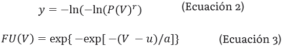 Posteriormente se calculó la variable reducida (y) para cada evento, representada por la ecuación ( 2), la cual se graficó contra los valores de velocidades de viento elevados al cuadrado (presión) para acelerar la convergencia hacia una distribución FT1. De esta gráfica se estimaron los valores de los parámetros de la distribución FT1. Finalmente, se determinaron las funciones de distribución de probabilidad acumulada de cada tipo de evento (Fu(v )), según la ecuación ( 3), a partir de la cual se obtuvieron las velocidades de viento correspondientes a la combinación para cada período de retorno requerido, según la ecuación ( 4).