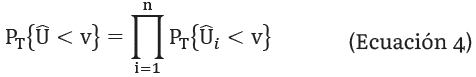 Donde Û es la velocidad de ráfaga máxima anual absoluta, Û i es la velocidad de ráfaga anual máxima del evento meteorológico i, PT [Û < v] y PT [Ûi < v] es la distribución de probabilidad acumulada de Û y Ûi, respectivamente, y n es el número de eventos meteorológicos significativos.