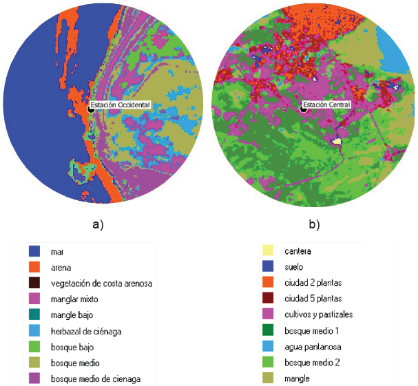 Luego de elaborada la clasificación no supervisada, se tomaron varios puntos de control para cada categoría, y con la ayuda de Google Earth y publicaciones de la vegetación de estas zonas [ 34] se identificó el tipo de cobertura que existía ( figura 2). Una vez reconocidas las distintas clases se asignaron los valores de longitud de rugosidad a cada uno de ellas a partir de la Clasificación de Davenport [ 22] y las nuevas clases añadidas por Wieringa [ 23]. En el caso de las zonas urbanas identificadas en la estación Central fueron empleadas las descripciones de Wieringa [ 23], en las que se recomienda para ciudades un valor entre 0,4 y 0,7 metros, además se tomaron referencias de otros artículos [ 20], [ 21] de ciudades semejantes.