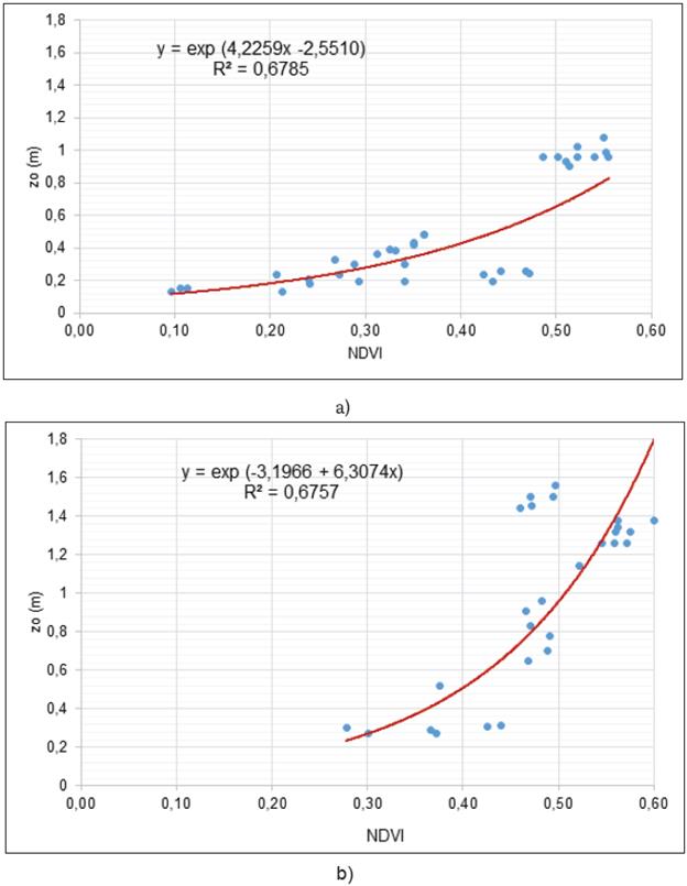 El análisis de los resultados según el método morfométrico se muestra en la figura 3, donde se exponen las gráficas del NDVI obtenido de las imágenes multiespectrales contra los valores de z0 determinados por la ecuación ( 9). Los parámetros de a y b se obtuvieron del ajuste de la curva exponencial. Los valores de R 2 superan el 60 %, lo que refleja un buen ajuste según las investigaciones relacionadas con este tema [ 29], [ 30].