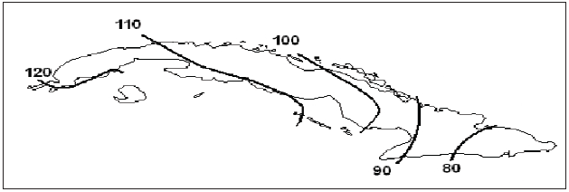 Vickery [ 31] empleó las mismas técnicas de simulación de huracanes sobre las que se sustenta la obtención de las velocidades básicas de la actual norma estadounidense [ 6] y obtuvo mapas de velocidades básicas, en mph y para intervalos de promediación de 3 s, para diferentes períodos de retorno sobre Cuba. En la figura 4 se muestra el mapa de velocidades de viento obtenido para 50 años de período de retorno.