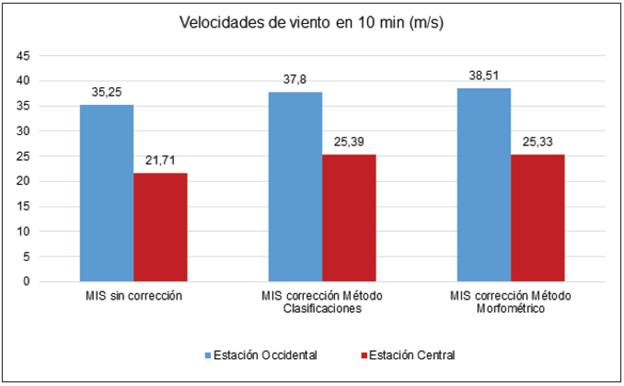 Por otra parte, las correcciones por exposición al MIS aumentaron los valores de la velocidad ( figura 5) debido a que la rugosidad alrededor de las estaciones es superior a la indicada por la OMM, lo cual confirma la influencia de las rugosidades en las velocidades de viento y la importancia de su consideración para determinar las velocidades básicas de viento a partir de los datos de estaciones meteorológicas con terrenos circundantes no ideales.