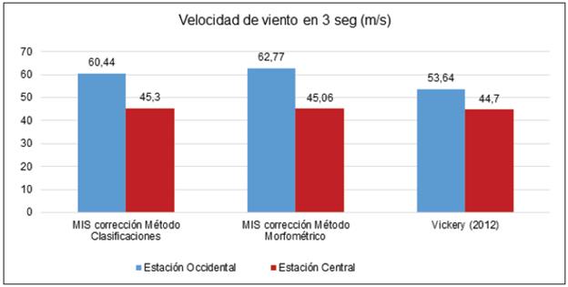 Según se observó, existe para la estación de la región Central una buena correspondencia entre los valores, mientras que para la estación de la región Occidental los valores obtenidos con el MIS en este trabajo son mayores que los obtenidos por Vickery.