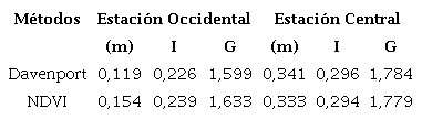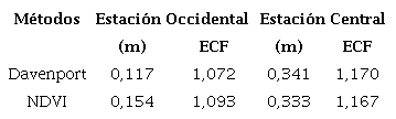 De acuerdo con los resultados obtenidos, se evidencia que existe una adecuada correspondencia entre los resultados de zo estimados por el método de las clasificaciones y el NDVI en ambas estaciones. Por lo tanto, se pone de manifiesto la potencialidad del empleo del NDVI para la obtención del factor de corrección por rugosidad.