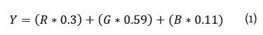 The image delivered by the video camera is resized to a size of 640x360 pixels, in order to guarantee the relationship between the space occupied by a person in the image frame and the threshold value subsequently defined for the segmentation of the moving object and the image background. The preprocessing starts with a conversion of the video shots to grayscale, thus obtaining the equivalent to the luminance of the image. The original image in RGB (Red, Green, Blue) color scale undergoes a transformation process according to the light intensities captured by the human eye, with a value of 30% red, 59% green and 11 % blue [21], as shown in equation 1.