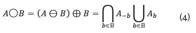 In addition to the Gaussian blur filtering, a morphological filtering step is applied. With this, the image is simplified and shape characteristics of the objects are maintained. In this case, mathematical morphology is applied in order to highlight the structure of the moving object. Morphological operations are performed with respect to a structural element, (an element with shape and size that can be variable, where the sectors with a value of 1 are those that take relevance in the process). The most common morphological operations are dilation and erosion, which generate expansion and thinning effects respectively [24]. In the present study, we propose the use of the morphological operation of opening, equivalent to initially applying an erosion and then a dilation, thus eliminating the external noise of the structure [25]. In addition, an elliptical-shaped structural element of size 5x5 is used. The mathematical basis of the morphological opening operation is presented in equation 4.