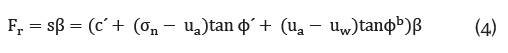 Al dividir la masa deslizante en dovelas, se obtiene que la resistencia cortante total disponible de cada dovela se calcula multiplicando la resistencia a cortante del suelo en la base por su longitud. Por lo tanto, a partir de la forma modificada de la ecuación de Mohr-Coulomb para un suelo parcialmente saturado, la fuerza de resistencia disponible se muestra en la ecuación 4.