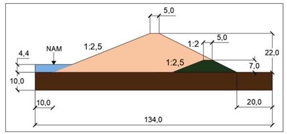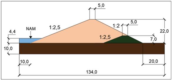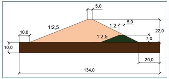 Tras una revisión de la base de datos del Instituto Nacional de Recursos Hidráulicos (INRH), el 69 % de las presas de tierra cubanas son homogéneas; de ellas, el 62 % presenta altura de cortina inferior a veintidós metros y cuyos procesos de construcción y mantenimiento se realizaron con base en la mecánica de suelos tradicional [6]. El modelo analizado es el de la presa de tierra mostrada en la figura 1.