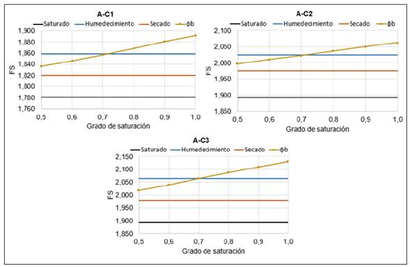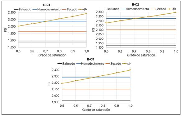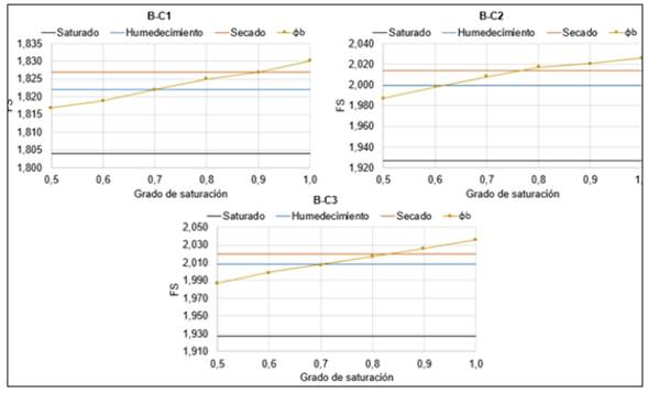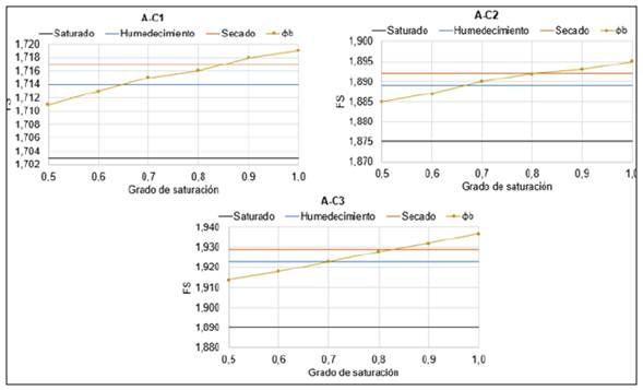 Diversos autores [9], sugieren que el valor del ángulo de succión se fije como φb =1/2φʹ o φb = 1/2 φʹ en función del caso analizado. A partir de los resultados obtenidos para estos suelos, se sugiere de forma general φb = 0,7 φʹ que en los análisis al final de la construcción. Dado que cuando φb = φʹ se obtienen valores de factores de seguridad muy superiores a los obtenidos con las curvas características experimentales.
