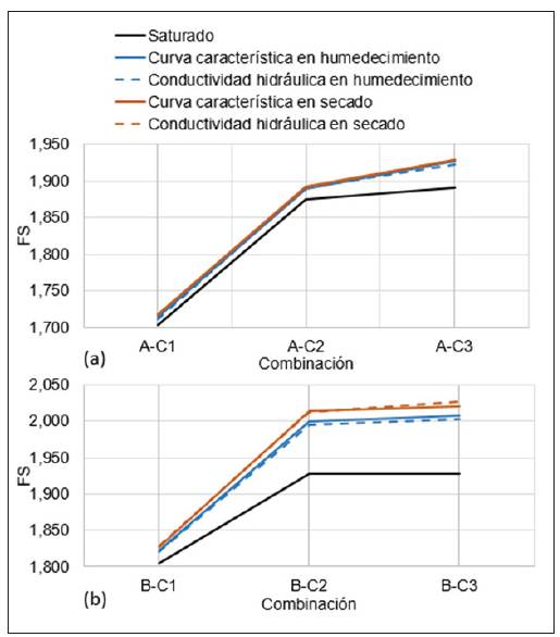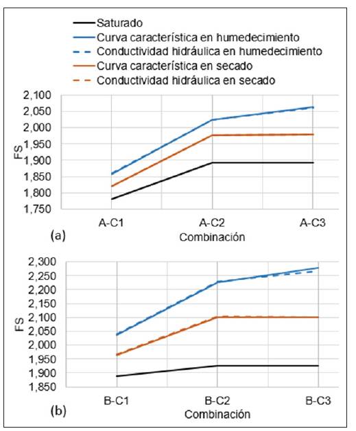 En las figuras 8 (a) y (b) no se observan diferencias entre los fs obtenidos para ninguno de los suelos empleando las curvas características y de conductividad hidráulica. Sin embargo, entre la rama en secado y la rama en humedecimiento existe una diferencia de hasta 5 % para el suelo A y 8 % para el suelo B. Entre el suelo saturado y parcialmente saturado se presenta una diferencia de hasta 10 % para el suelo A y 19 % para el suelo B. Este comportamiento se asocia a las restantes propiedades físicomecánicas de los suelos, como la cohesión y el ángulo de fricción interna. Adicionalmente, el fs aumenta si lo hacen las propiedades de la base; por lo tanto, para las combinaciones con la base tipo C1 se obtuvieron FS inferiores a las correspondientes con la base tipo C3, sin importar si el suelo de la cortina se encontraba saturado o parcialmente saturado.