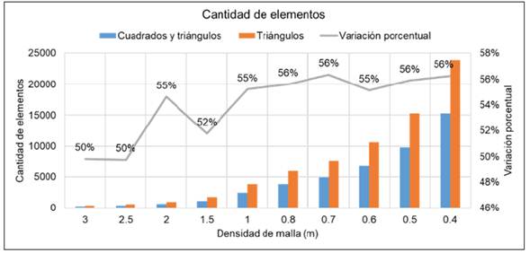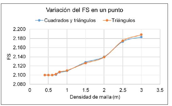 En la figura 6 se observa que el FS disminuye al reducir la densidad del mallado. La variación es de 4 % para ambos tipos de elementos analizados, lo cual no resulta significativo [2]. A partir de una densidad de 0,6 metros, el FS no muestra variaciones; por lo tanto se selecciona una malla conformada por cuadrados y triángulos con una densidad de 0,6 metros.