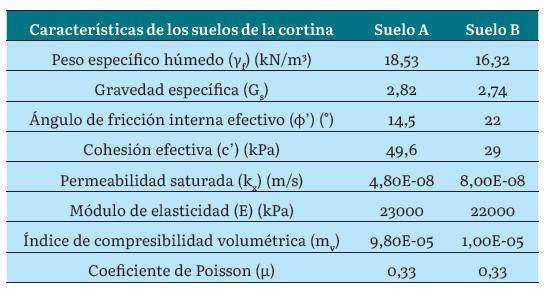 Como material de cortina se usan dos tipos de suelos con clasificación CH (arcillas de alta compresibilidad), pero diferentes valores de sus parámetros físico-mecánicos (tabla 1). En la base se modelan tres suelos con clasificación SC (arena arcillosa). A partir de la combinación de los tipos de suelos en la cortina y la base se establecen relaciones entre el ángulo de succión y de la curva característica de suelo no saturado. La relación de permeabilidad establecida es kx = i2ky [2], [12].