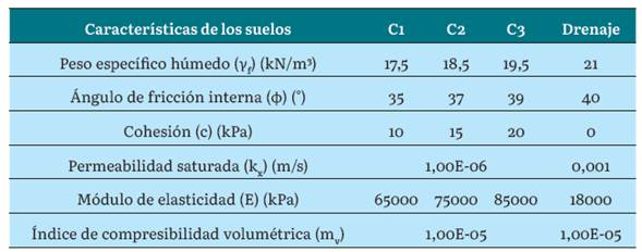 Las tres bases estudiadas se tienen en cuenta considerando el estado de saturación to tal, mientras que el drenaje fue definido considerando que debe ser un material grueso con alta permeabilidad [14], [15]. La relación de permeabilidad establecida en todos los casos es unitaria [2]. Las propiedades correspondientes se muestran en la tabla 3.