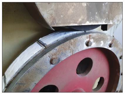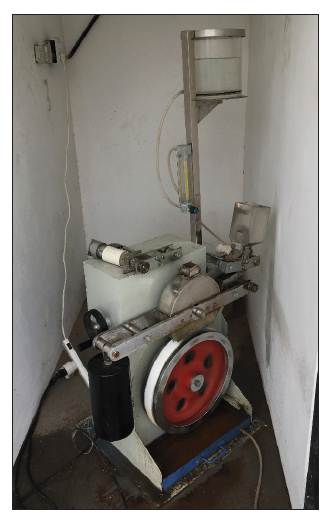 En la figura 1 se muestra el equipo implementado que cuenta con una rueda de ensayo de caucho maciza que gira a una velocidad de 343 vueltas/min, sobre cuya periferia lisa y plana se fijan 14 probetas para conformar una superficie continua de rodadura sobre la que apoya y circula la rueda de caucho. Durante el ensayo, se utilizó un dispositivo para la alimentación de agua, que consistió en un recipiente cilíndrico transparente con boca ancha, provisto de una tapa sifónica. Dicho recipiente iba situado en un soporte superior y a una altura constante, respecto al punto de entrada del agua en la zona de alimentación sobre la rueda de ensayo. El agua desembocó desde el depósito en un compartimento solidario con la rampa del abrasivo (no utilizado en este caso).