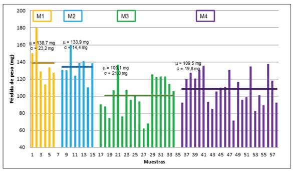 La figura 3 presenta el gráfico con los resultados de pérdida de peso (mg) obtenidos con el equipo de Pulimento Acelerado sobre las muestras ensayadas de las pinturas M1, M2, M3 y M4.