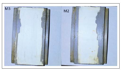 En la figura 4 se muestran imágenes, tomadas en condiciones controladas de iluminación, de las probetas pintadas con las pinturas M2 y M3, en las cuales se pudo observar la falla mencionada.