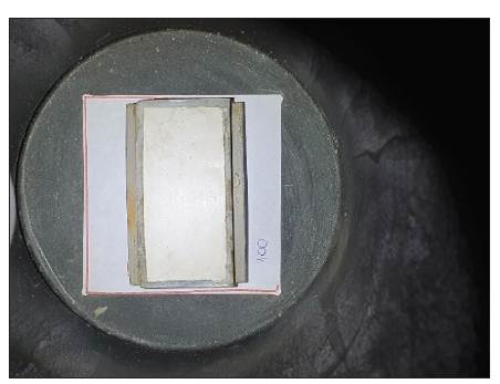 En la figura 5 se presenta la imagen de una probeta luego del ensayo mediante la toma de fotografía con el uso de la cabina portátil, con la finalidad de presentar el mecanismo utilizado. Se consideró relevante poder comparar la muestra, antes y después del ensayo, para detectar si hubo pérdida o desprendimiento de la película de pintura. En caso de que ocurriera, debe descartarse la muestra correspondiente.