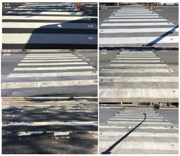 En la figura 6 se presenta la comparación de la senda peatonal a lo largo del tiempo. En la imagen izquierda, se observa el deterioro sufrido en las pinturas M3 a pocos días de aplicada. Es evidente, por su aspecto visual, que se debe al desprendimiento de la película de pintura. Además, es preciso relacionar este fenómeno, con las condiciones climáticas adversas mencionadas de temperatura, humedad y precipitación. En la imagen derecha se presenta la pintura M4, la cual, transcurrido los 4 meses, presentó un desgaste principalmente en la zona con pavimento de hormigón (Franjas F3 y F4). A pesar de ello, se puede decir que demuestra un buen comportamiento en servicio.