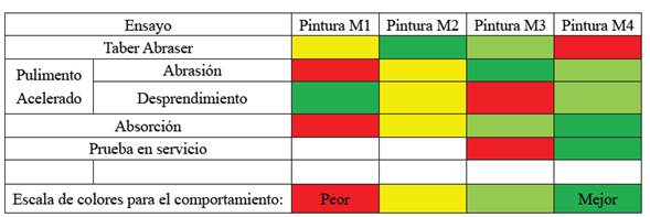 En la tabla 1, con un formato de doble entrada, se presenta un resumen de los resultados de las distintas muestras de pintura en cada uno de los ensayos realizados. Para ello, se utilizó una escala de colores para indicar el material que evidenció el mejor comportamiento (color verde) y el peor comportamiento (color rojo).