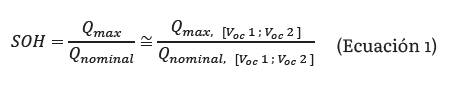 Estado de salud SOH: El SOH se puede estimar como la relación entre la capacidad máxima en Ah de descarga (Qmax) del sistema con relación a su capacidad nominal (Qnominal) durante un ciclo de carga descarga definido por los voltajes de circuito abiertoVod y Voc2.
