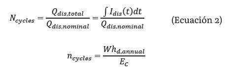 Número de ciclos: Los ciclos de operación producen un envejecimiento del sistema que se adiciona al envejecimiento calendario y a la degradación por otros factores como temperatura, corrientes o voltajes operacionales. El número de ciclos se puede estimar considerando la relación entre la energía total de descarga (Qdis,total) y la energía de descarga nominal (Qdis,nominal) durante un periodo de tiempo determinado.