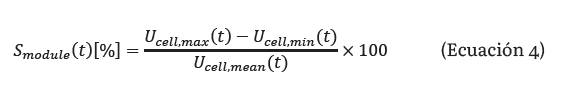Balance de voltajes de celdas: Este factor se determina de forma porcentual como la variación de los voltajes de las celdas con relación al valor promedio, la disparidad de voltajes en celdas conectadas en serie puede afectar la capacidad del sistema para entregar energía y degradar aceleradamente las celdas que operan fuera de rango.