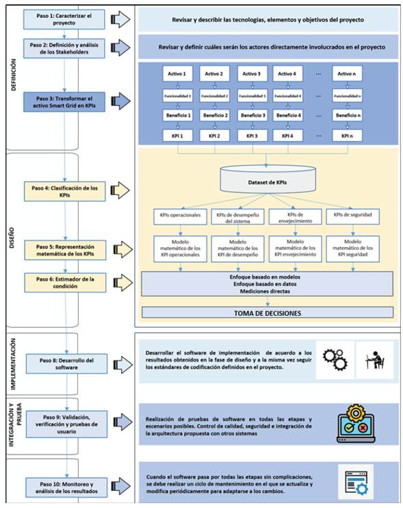 Los proyectos BESS están compuestos por hardware, software, procesos, procedimientos, políticas y actores, cada uno de estos factores se debe analizar de forma holística. Por esta razón, se propone un marco metodológico que permita tener una visión general del BESS y describir las etapas y tareas involucradas en cada fase. De manera general, cualquier sistema incluye las fases de análisis de requisitos, diseño/ planificación, prueba, implementación y operación. Tomando como referencia la investigación presentada en [29], la propuesta metodológica se dividide en cinco fases con 10 pasos.