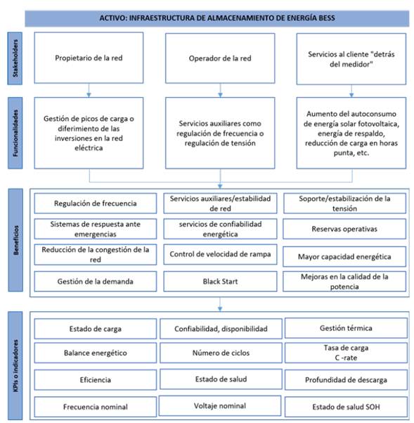 Este paso se divide en 4 partes y considera el análisis de varios aspectos fundamentales para el proyecto bajo estudio, en este caso en particular los sistemas bess [31]. Los aspectos analizados son: Actores o involucrados del proyecto, funcionalidades, beneficios y definición de Kpis o indicadores. En la Figura 3 se presentan estas etapas.