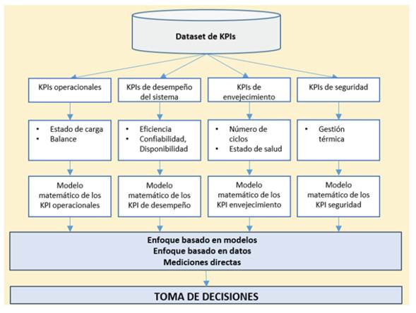En [22] se evalúan cuatro categorías de kpis. En la primera categoría se estudian los indicadores operativos a través del estado de carga y el balance; en la segunda categoría se proponen variables de eficiencia y una cuantificación de la disponibilidad; en la tercera categoría se cuantifica el envejecimiento de las baterías a través del número de ciclos y el estado de salud. Finalmente, en la cuarta categoría se presenta un análisis sobre la gestión térmica del bess. Los kpis se implementan y se explican desde un punto de vista crítico, aprovechando la estadística a grandes volúmenes de datos, incluso los datos con cálculos sencillos pueden conducir resultados satisfactorios.